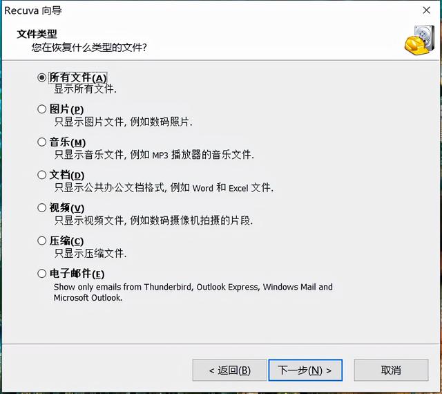 然后选择需要恢复文件的类型,包括图片、音乐、文档、视频、压缩和电子邮件,如果你想要全盘恢复的话,就选择所有文件点击下一步: