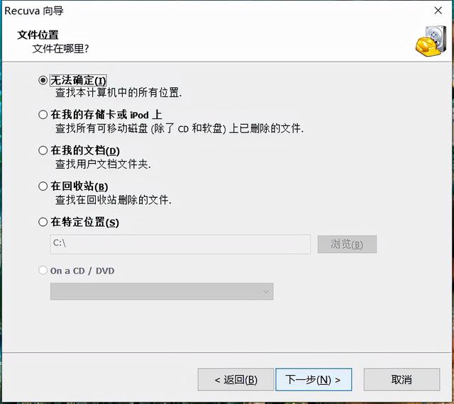 选择需要恢复文件的所在位置,可以选择硬盘或者内存卡,前提是你的内存卡或者手机已经链接电脑,之后点击下一步