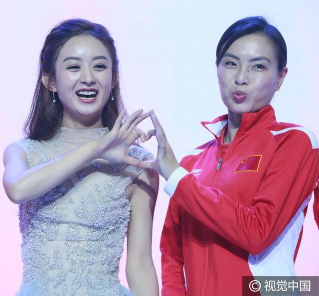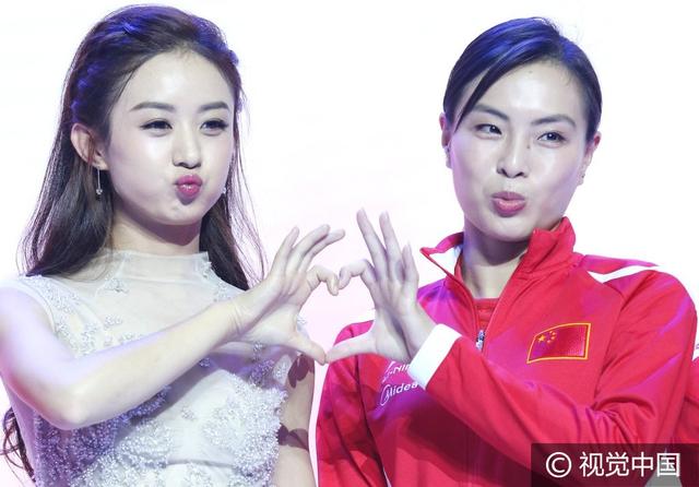 2016年09月05日讯,上海,09月05日,赵丽颖一袭薄纱露背长裙来沪捞金 ,与奥运冠军吴敏霞一起嘟嘴比爱心萌翻全场。奥运情侣何姿秦凯求婚后同框秀恩爱比爱心。 图片来源:视觉中国