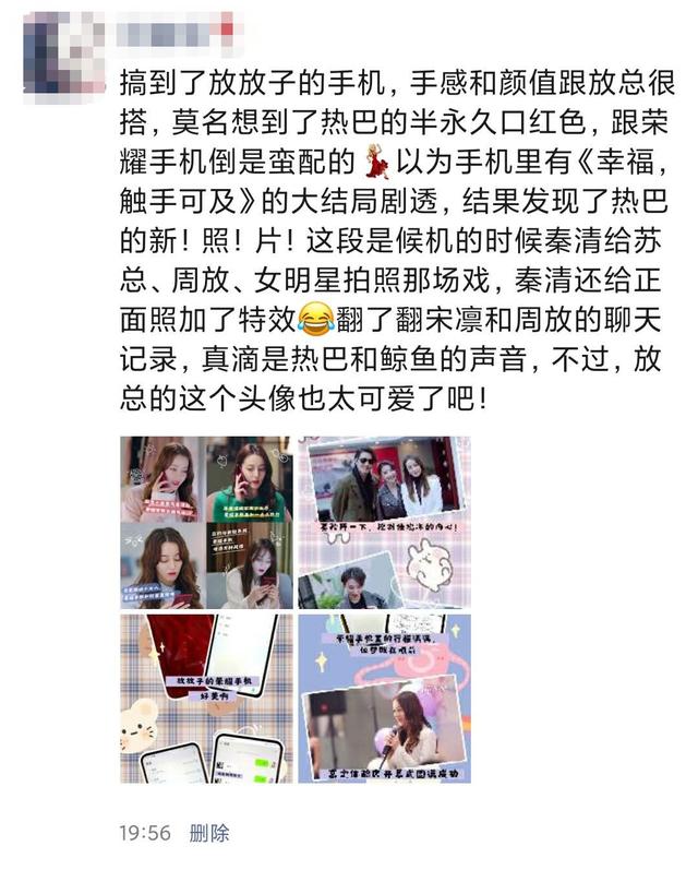 此外,"剧情番外"让荣耀手机更好看。大结局前后,曾有网友曝出拿到迪丽热巴亲自用过的手机,其中包括剧中出现的米兰时装周日程表、周放工作室的用户爱好调查,由此可以看出剧方对细节要求非常到位。