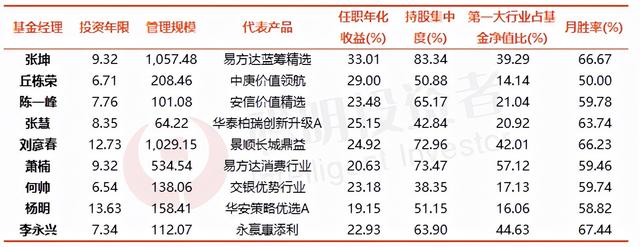 投资风格辨识度高,标签醒目——张坤、丘栋荣、陈一峰、张慧、刘彦春、萧楠、何帅、杨明、李永兴