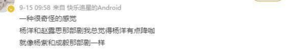有网友称:一种很奇怪的感觉,杨洋和赵露思那部我总觉得杨洋有点掉咖,就像杨紫和成毅那部剧一样。