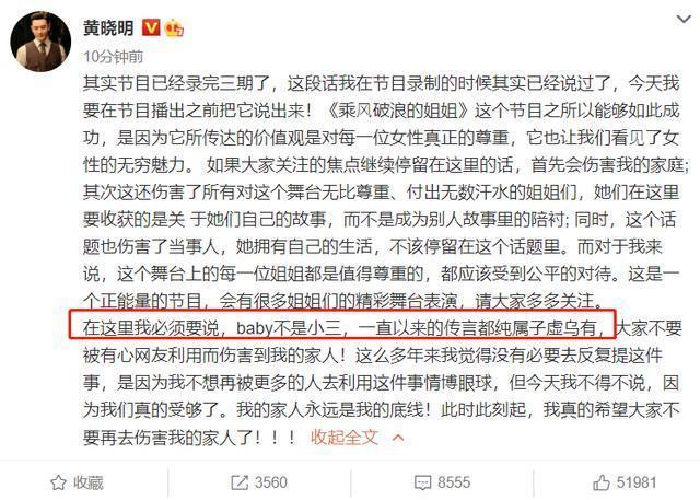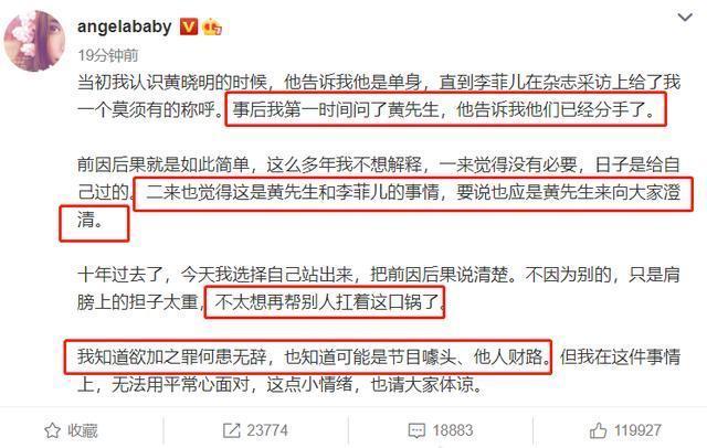 baby发文后,黄晓明也是很快发文表示,baby不是小三,为baby正名。