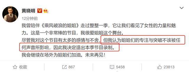 由于事情闹得很大,黄晓明于1月10日也是官宣退出《浪姐2》,希望姐姐们的专注和突破不要被任何声音影响。
