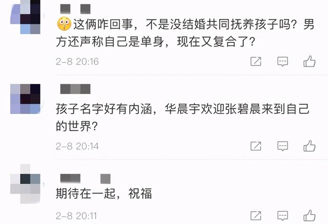 网友们在看到华晨宇与张碧晨的近况后,有人评论:“孩子名字好有内涵,华晨宇欢迎张碧晨来到自己的世界?”还有人表示很疑惑,称:“这俩咋回事,不是没结婚共同抚养孩子吗?男方还声称自己是单身,现在又复合了?”