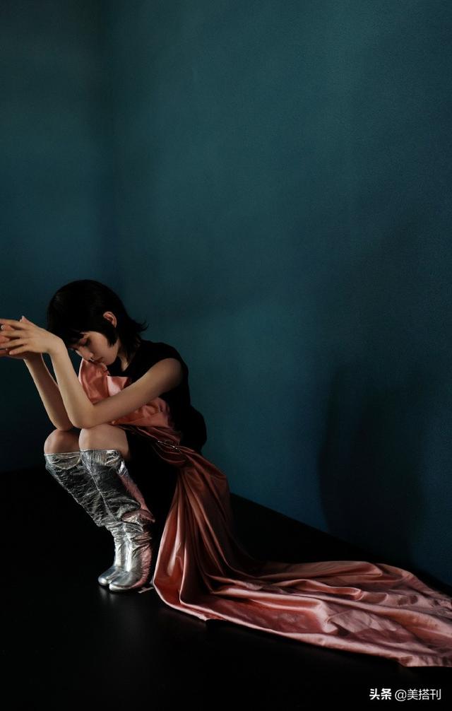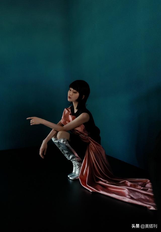 耳朵和脸颊的位置也有头发,短了一点,发型很有层次感,有及肩长度,有和下巴齐平的长度。刘海遮住了额头,因为发型酷帅前卫,所以妆容也要适当浓一点,尤其是眼妆,虽然是淡颜系美女,但眼妆浓一些刘诗诗也能hold住。除了妆发,衣服也非常潮流,拼接礼裙,既修饰了身材,又增添了设计点,一双银色高筒靴,有点未来女战士的范儿。