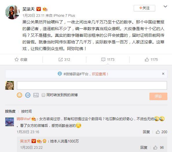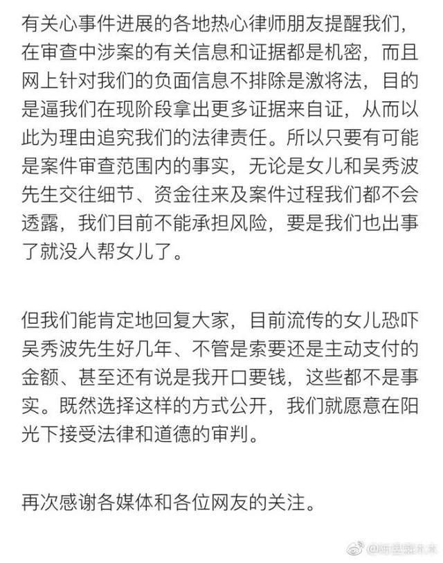 而网友们也在围观吴秀波方的声明的时候,因为其中署名为何震亚的声明而吐槽。网友纷纷猜想,这到底是吴秀波拉自己妻子出来挡枪,还是正房抱着“你可以动我的人但不能动我的钱”的想法?