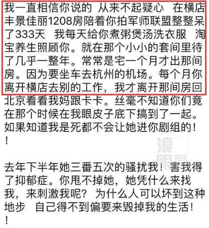 接着说自己在吴秀波拍《军师联盟》的时候在酒店窝了333天,一直照顾吴秀波。然而这样还是没能阻止吴秀波再找别人,结果她被骚扰甚至患上了抑郁。