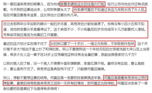 对待妻子并不算厚道的吴秀波,为什么给她打了那么多钱?何震亚声明中的威胁恐吓,让六六将陈昱霖讨要钱财的气势形容为“就像和珅抄家”的底气,只有吴秀波出轨的料吗?