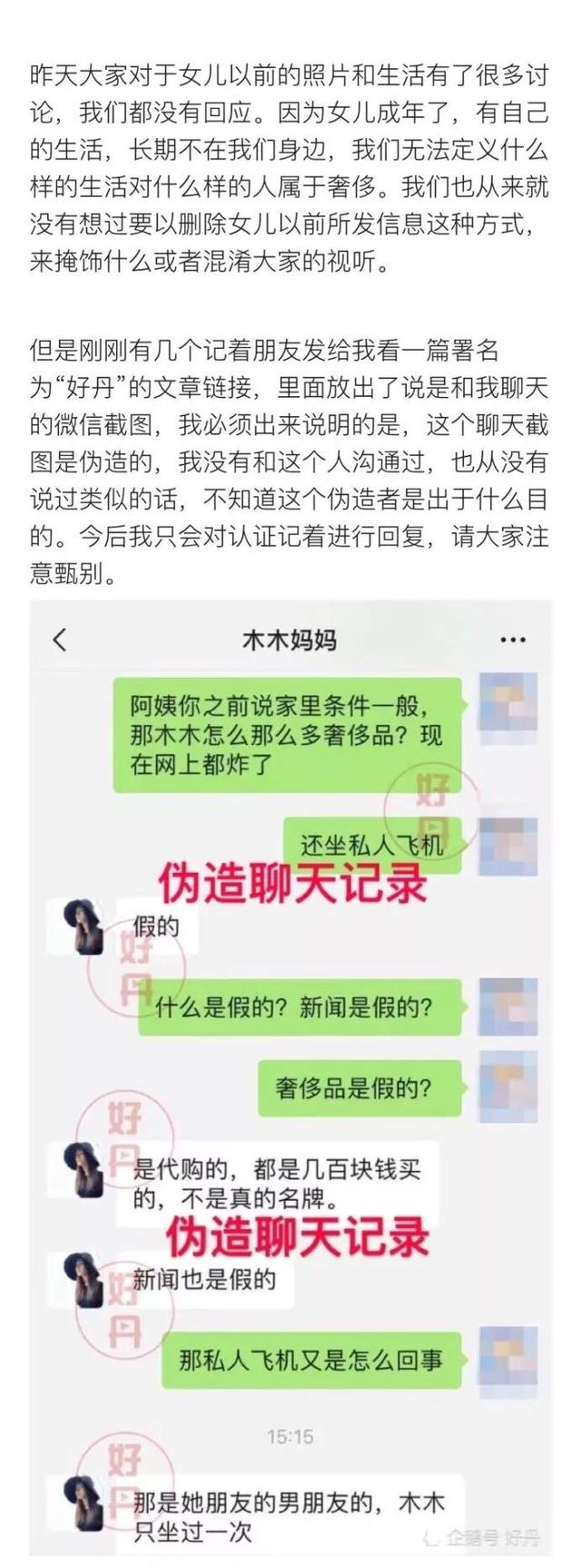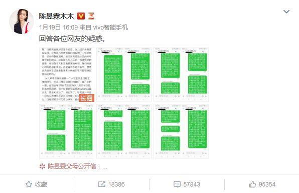 对于这些信息,网络上有一张陈昱霖妈妈回应“ins上的图都是假货”的截图,不过就在今天晚上,陈昱霖的父母通过微博账号辟谣,这张对话图是PS的。
