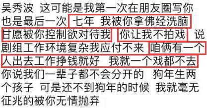 2018年9月24日,陈昱霖在朋友圈控诉吴秀波,曾被其用佛经洗脑控制,在他的劝说下不工作,并承诺会一直在一起,还会生两个孩子,结果现在却被无情抛弃了。