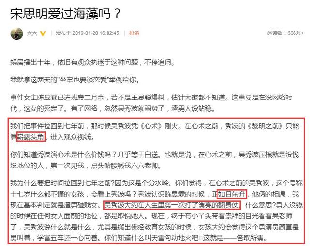 在这篇文章的开头,六六说,吴秀波时是终于崭露头角,就和小三勾搭上了。
