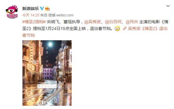 今天下午,《情圣2》片方也终于怂了。当初吴秀波出轨时,片方那么淡定,但事情发酵到现在这种地步,终于坐不住,将影片提档到了1月24日。