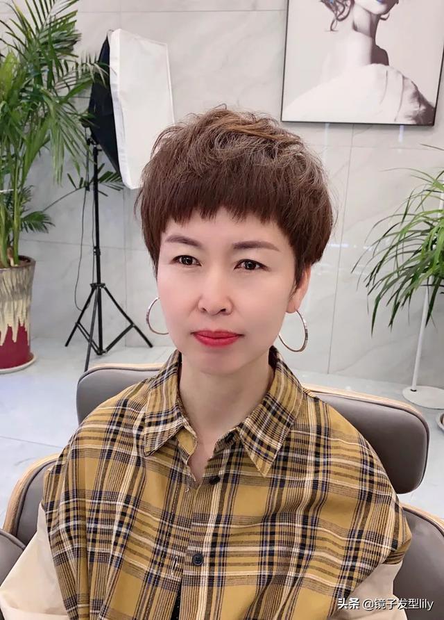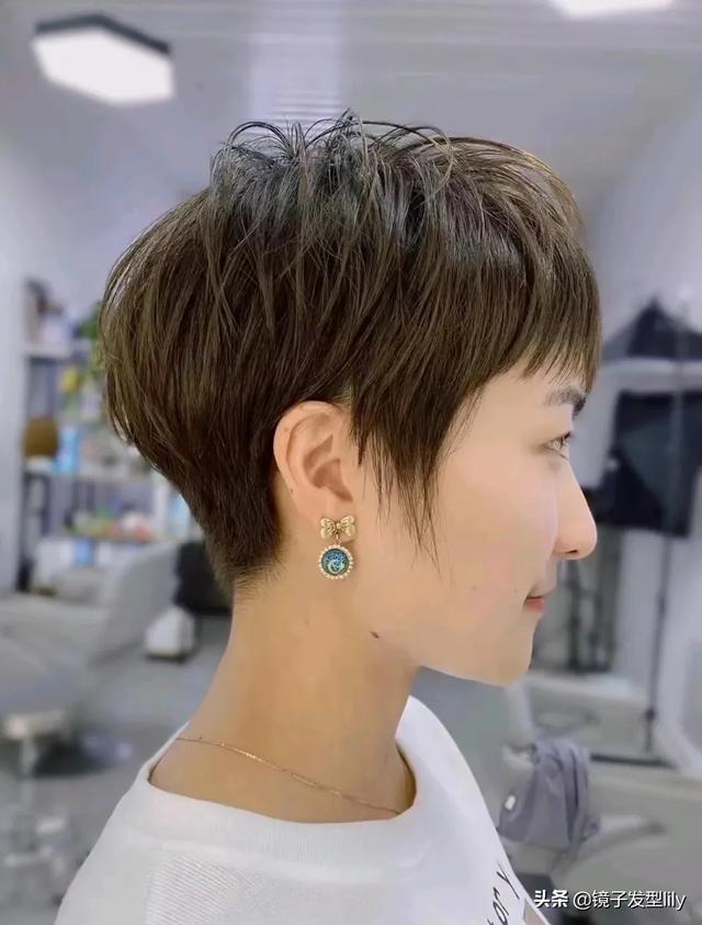 短发可以说是解暑发型的标配发型,超短的发型露出脖颈和耳朵,一看就很清凉利落,三角形的尖鬓角配上个宝石绿的珍珠耳环,越发的精致显气质。