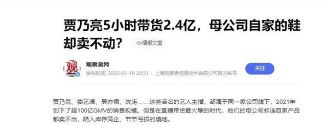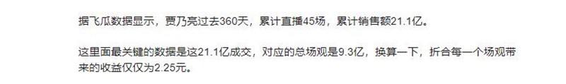 另外根据网络数据显示,贾乃亮虽然带货业绩惊人,但折算之后单人收益却很低,还被官媒点名曝出其母公司节节亏损、现状窘迫。