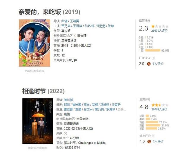 贾乃亮近两年出演的影视剧佳者寥寥,不但搭档陈意涵主演的言情剧口碑崩盘,连跟正午阳光合作的《相逢时节》都翻了车。那档脱胎于韩综的《亲爱的,来吃饭》,更是因为细节问题被全网嘲,评分只有惨不忍睹的2.3。