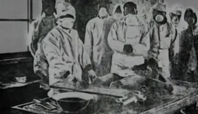 731部队实验人员将男孩全身麻醉之后,依次的从他身上取出肠、胰、肝、肾、胃等各种内脏,然后将男孩的头盖骨据掉,把男孩的脑子取出了,最后男孩的身体就只剩一个空躯壳了。
