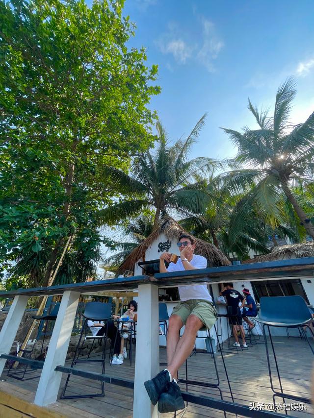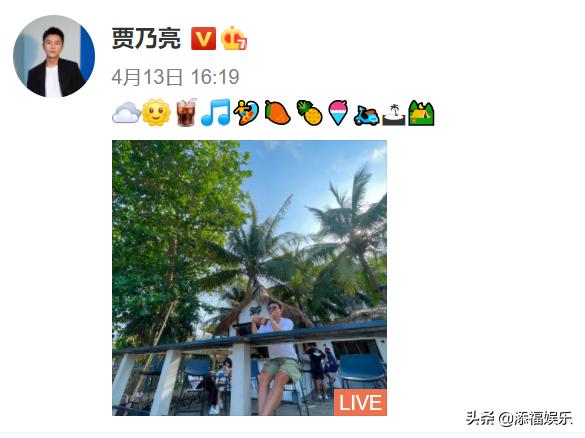 4月13号,贾乃亮也发布了动态,是在海南三亚度假的照片,后面有很高的椰子树。