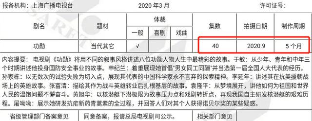 第二个变数就是郑晓龙导演接拍电视剧《功勋》,这部剧形式类似《我和我的祖国》,都是以单元的形式讲述故事,郑晓龙不但是其中一个单元的导演,更是全剧的总导演,《有翡》杀青时正好开始筹备,备案显示开拍时间是9月。