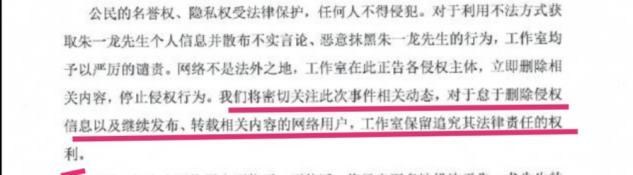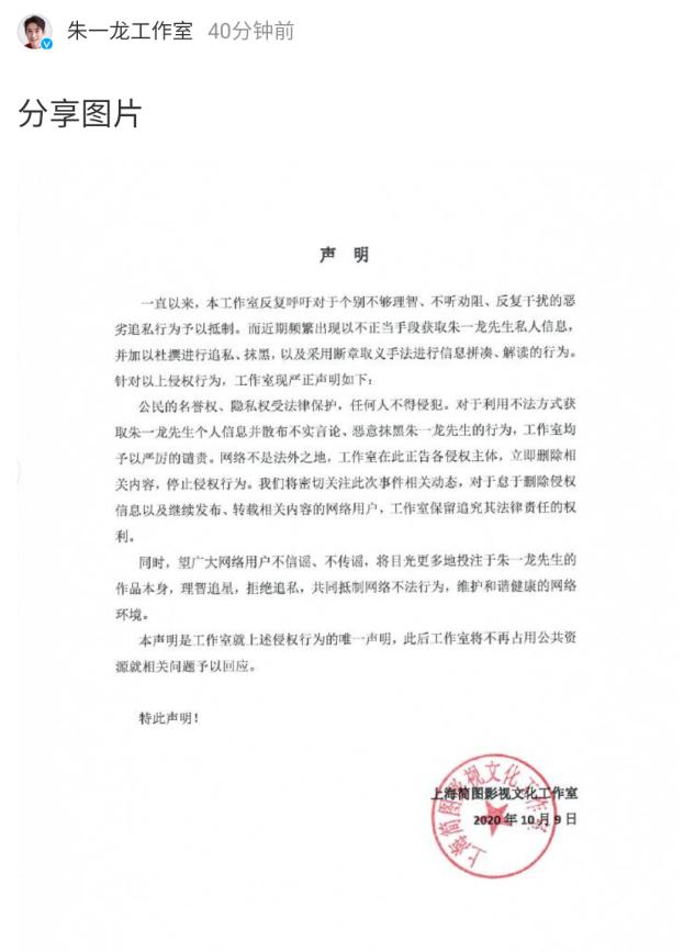 10月9日,朱一龙工作室发声明回应了近日隐婚生子和三代还宗的传闻,工作室表示最近频繁出现用不正当手段获取朱一龙的私人信息的行为,并且对方将这些信息用来杜撰抹黑,对于这些侵权行为工作室作出警告。