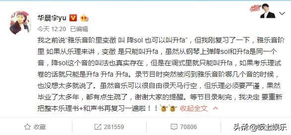 估计华晨宇也注意到了网上的消息,今天中午华晨宇发文表示乐理必须要严谨,由于自己毕业多年,有的知识有点生疏了,等节目录完要重新看乐理和和声书,最后还不忘感谢大家的提醒,华晨宇的态度是十分诚恳的!而且在文中详细的说了一遍相关的知识!