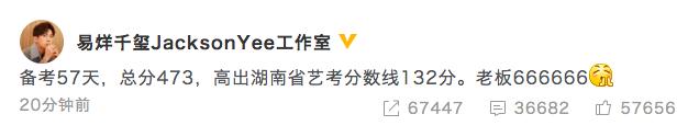 今日,易烊千玺工作室在微博发文称:“备考57天,总分473,高出湖南省艺考分数线132分。老板666666!”易烊千玺的高考分数正式公布,也在此祝贺准大学生易烊千玺。