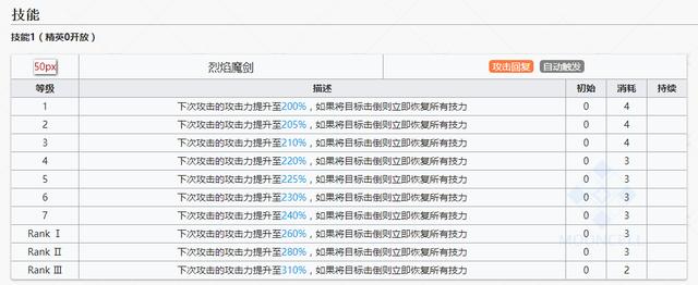 优秀的攻回型一技能模板,专精三后倍率高达310%。310%是什么概念呢?银灰和煌的强力击专三均为290%,而其他职业的类似技能也基本没有如此高的倍率,以800攻击力计算,触发特效时可造成2480点法术伤害;并且烈焰魔剑的消耗仅为2,正常情况下每三下就能触发一次,而它还有一个额外的增益效果,击杀目标立即恢复所有技力,配合技能的高倍率不断杀敌永续烈焰魔剑并不是梦。由于专三后消耗才减为2,但从倍率和效果来看哪怕是一技能它也有专三的价值。
