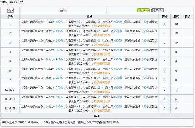 自动回复,手动触发的技能。开启后立即回复所有生命,攻击力大幅提升,攻击距离和攻击目标均+2,生命上限+5000,逐渐失去生命,持续时间无限。三技能的强大之处首先在于它的倍率,专三后攻击力+330%,原本800的攻击力提升为3440,假设打4的情况下DPH就是3440*4=13760!DPS则是13760/1.25=11008。尽管是理论值,但每秒上万的法伤也相当恐怖了,称三技能其为地面火山比地面小火龙更为合适。