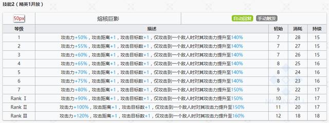 自动回复,手动触发的技能。开启后攻击距离和攻击目标数均+1,仅攻击到一个敌人时攻击进一步提升。技能升级和专精后提升伤害倍率及回转和持续时间数值,专三为+120%攻击力,仅打一个敌人时为160%,初始12点技力,消耗18点技力,持续18秒。
