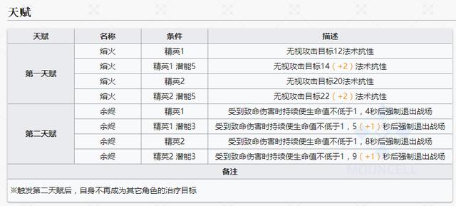第二天赋【余烬】效果为受到致命伤害时持续使生命值不低于1,也就是所谓的“锁血”,精二练度下8秒后强制退场,3潜再加1秒;并且触发余烬后,史尔特尔不会成为其他角色的治疗目标。不考虑潜能的话,8秒锁血属于在煌之上幽灵鲨之下,缺点是强制退场。第二天赋的意义更多的是跟三技能的高额扣血配合在退场前尽可能输出。