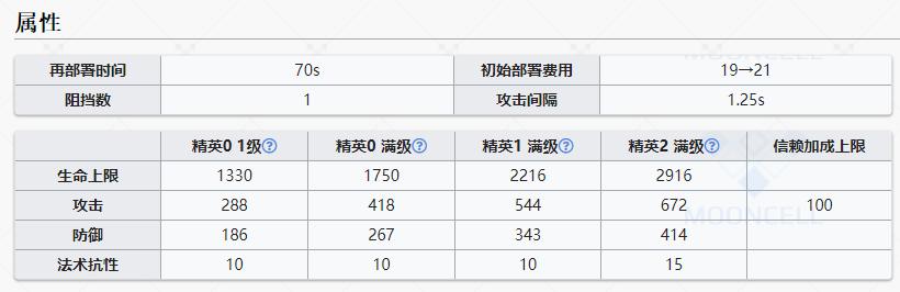 精英二满级后生命上限2916,攻击672,防御414,法术抗性15。初始攻击面板相较陈除外的其他六星近卫要低一些,但史尔特尔的信赖加成数值全给了攻击力这一项上,并且最高加成100点,配合4潜的+28,