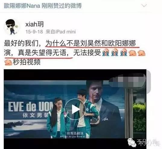 记得这部网剧当初选角时本意定的也是刘昊然与欧阳娜娜的组合,后来不造为什么女主角换了谭松韵,而欧阳娜娜居然还点赞了CP粉不满换角的微博: