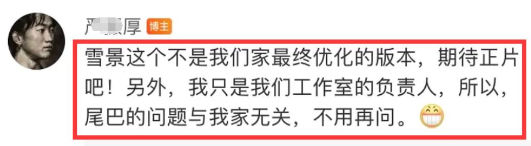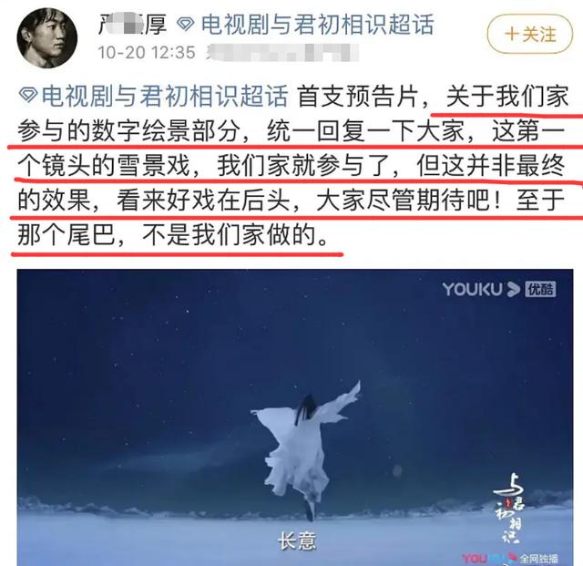 因为关于这部剧的特效和造型槽声很多,负责该剧特效的相关人员也称,第一个镜头的雪景戏是他们公司做的,但鱼尾不是,让大家期待最后优化完的版本,但也有人质疑他是在甩锅,后面他就删了微博重发,最后直接把微博都删了。