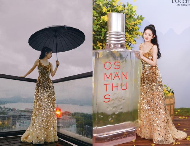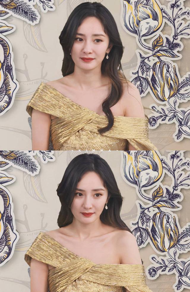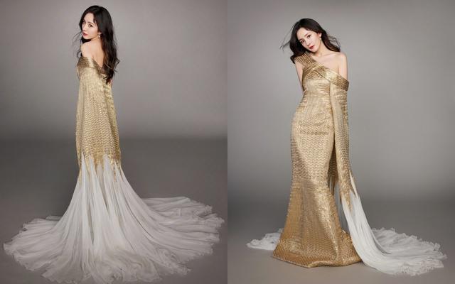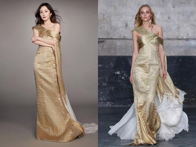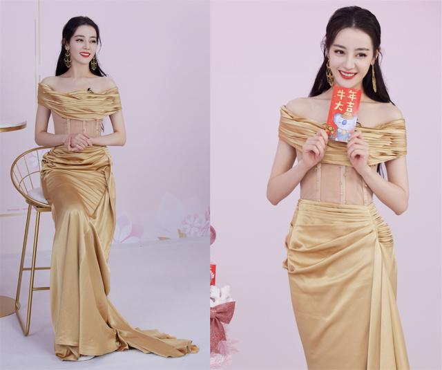 当然,不要以为热巴这套直播造型已经够隆重了。翻看她的直播造型你会发现,同样有不少红毯造型标准的造型。比如这套金色礼服的造型,放在任何一场红毯上都能大杀四方吧。