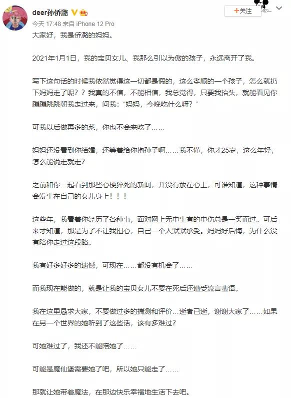 在离世之后,孙侨潞竟然又经历了一场无声的网暴,这让孙侨潞的妈妈很是痛苦,多次发声希望大家不要过度关注她的死因,可惜并没有用。