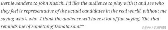 当然,不排除导演是在卖2016年大选之年的噱头,紧贴时事,把美国大选、辩论、政治主张搬上大荧幕,以期待提高影片的票房和话题度。