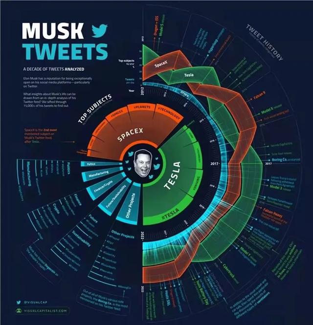 数据分析网站Visual Capitalist 总结了马斯克近十年推文内容