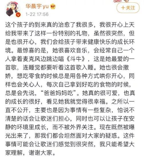 之后华晨宇更是更新长博文,表示孩子的到来也为他带来了不少的快乐。不得不说这个男人很有担当。