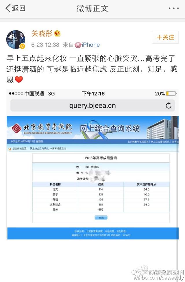 今天高考放榜,国民闺女关晓彤晒高考成绩单,总分552分!超出今年北京艺术类本科线206分!其中,关晓彤的数学成绩高达131分。而另一明星考生张雪迎也以总分415分、高出北京文科艺术院校录取分数线69分的成绩,被中央戏剧学院录取。他还特别对47分的数学成绩做出解释,称数学从未好过,希望大家“轻喷”