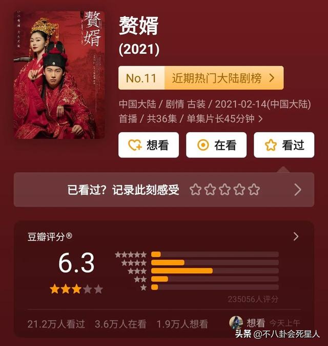2021最火的剧集,无疑是由郭麒麟和宋轶主演的《赘婿》了。58.7亿的播放量,6.3的评分,《赘婿》成功成为了2021电视剧的最大赢家。