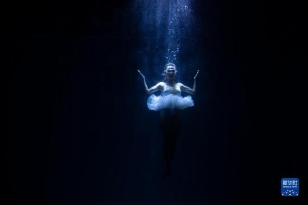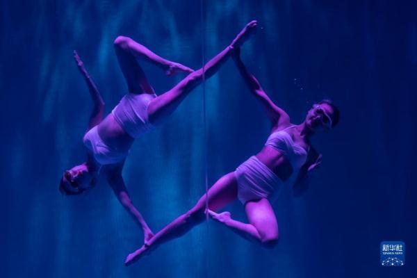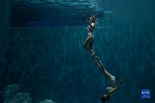 当日,在哈尔滨极地公园全新打造的水舞秀场中,两位舞者在“冰海”深处表演高难度“水舞秀”,喜迎即将到来的2022年。