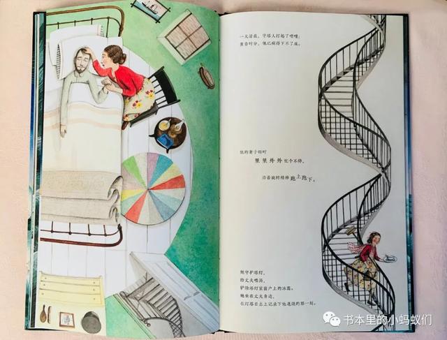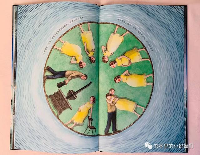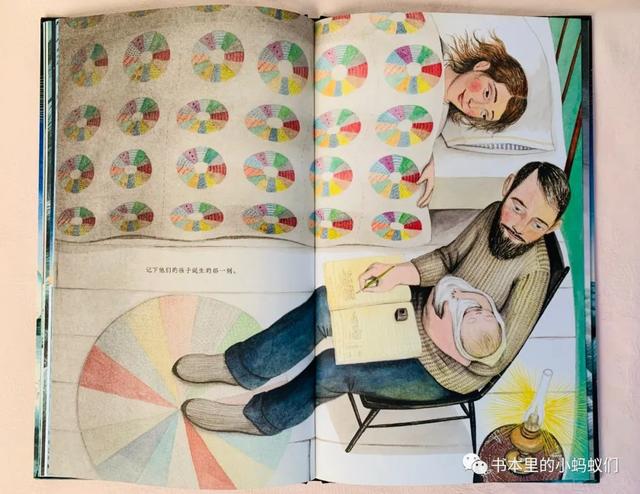 “最有意思的是夫妇二人等待宝宝出生的对开页,摊开后完整的圆形正好在中间,人沿着边壁走动,竟有一种钟表指针的感觉,似乎能让人感受到那种等待的急切。插画家在这里并未完全写实。”