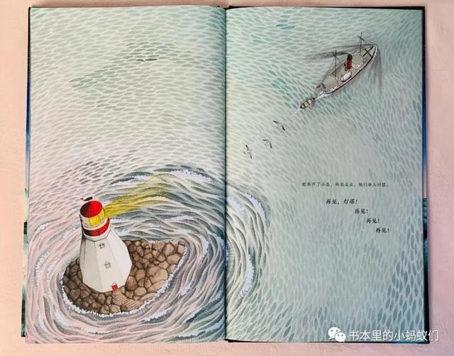 船离开了小岛,碎浪一圈圈荡漾开来,他们举头回望,和灯塔说再见:“再见,灯塔!再见!再见!再见!”