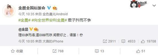 今日,有媒体对金晨进行采访,被问及“微博事件”,金晨回答:“我也不知道我为什么突然间发这条微博,应是积压了一些情绪不知该怎么宣泄。”被问及是否后悔,金晨则爽快表示:“没有没有,完全没有!挺爽的!”