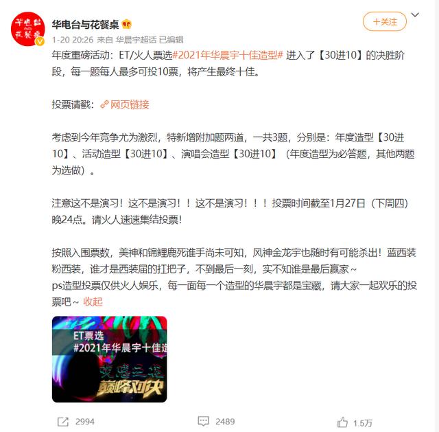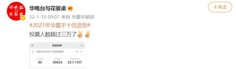 2022年1月6日,微博粉丝账号“华电台与花餐桌”发起了“2021华晨宇十佳造型”票选活动,参与活动者为广大华晨宇歌迷朋友。