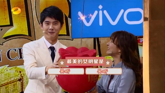 在游戏环节,两个人为一组,手里接龙传递“炸弹”,考验彼此的默契程度。在传到刘昊然和吴昕这一组时,问题是“最漂亮的女明星是谁”。此时,刘昊然的头脑里闪过多位合作过的女明星的脸
