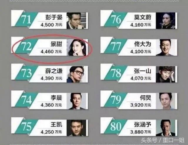 但是景甜也很有钱啊,去年景甜收入4460万,虽然跟一线明星收入有差距,但是也不少了,只比张继科少一千多万,而且现在娱乐圈片酬疯涨,景甜未来前景可观啊!