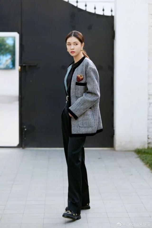 宋妍霏也算是大家公认的时髦女孩儿了,而且她的时髦是将潮流与风格平衡地刚刚好。就拿这套look来说,既适合日常也很有个人风格。CC自称这套是“酷酷的御姐style”,但编辑却从中看到了一丝丝复古韵味,金属质感的耳饰更是点亮了整套穿搭。