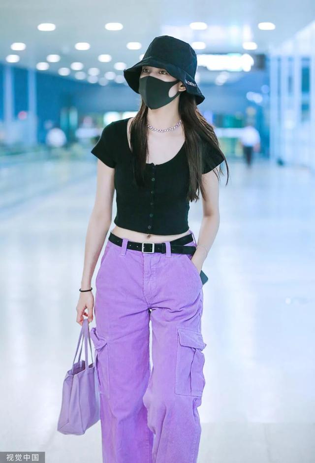 常看宋妍霏微博和ins的朋友一定知道,她的日常搭配其实都是非常colourful的,花花绿绿的造型不在少数,机场也很常见。像这套比较街头的穿搭,哪怕紫色的工装裤已经十分抢眼,也要搭配上Love-Philter的项链来增强吸睛度。