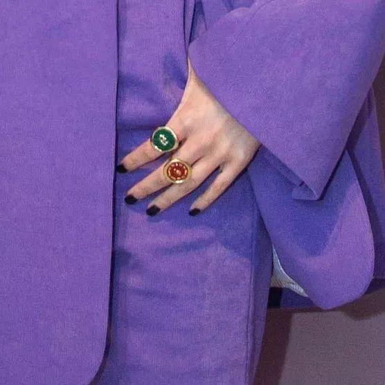 觉得老花有点难hold?纯色系的休闲套装照样复古。银质项链增加造型的层次感,红、绿两色的戒指则是让这种复古韵味更上一个台阶。